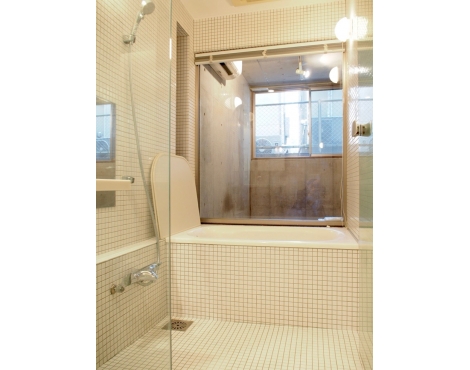 ダークグレーのタイル貼りの空間の奥には小上がりになった和室が登場。