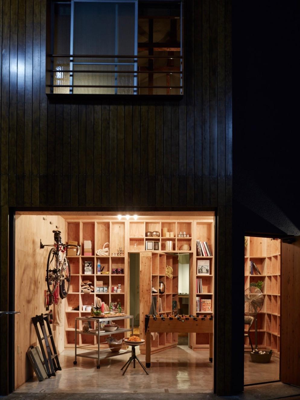 ガレージには壁一面の収納があり、まさかの回転扉という遊び心。