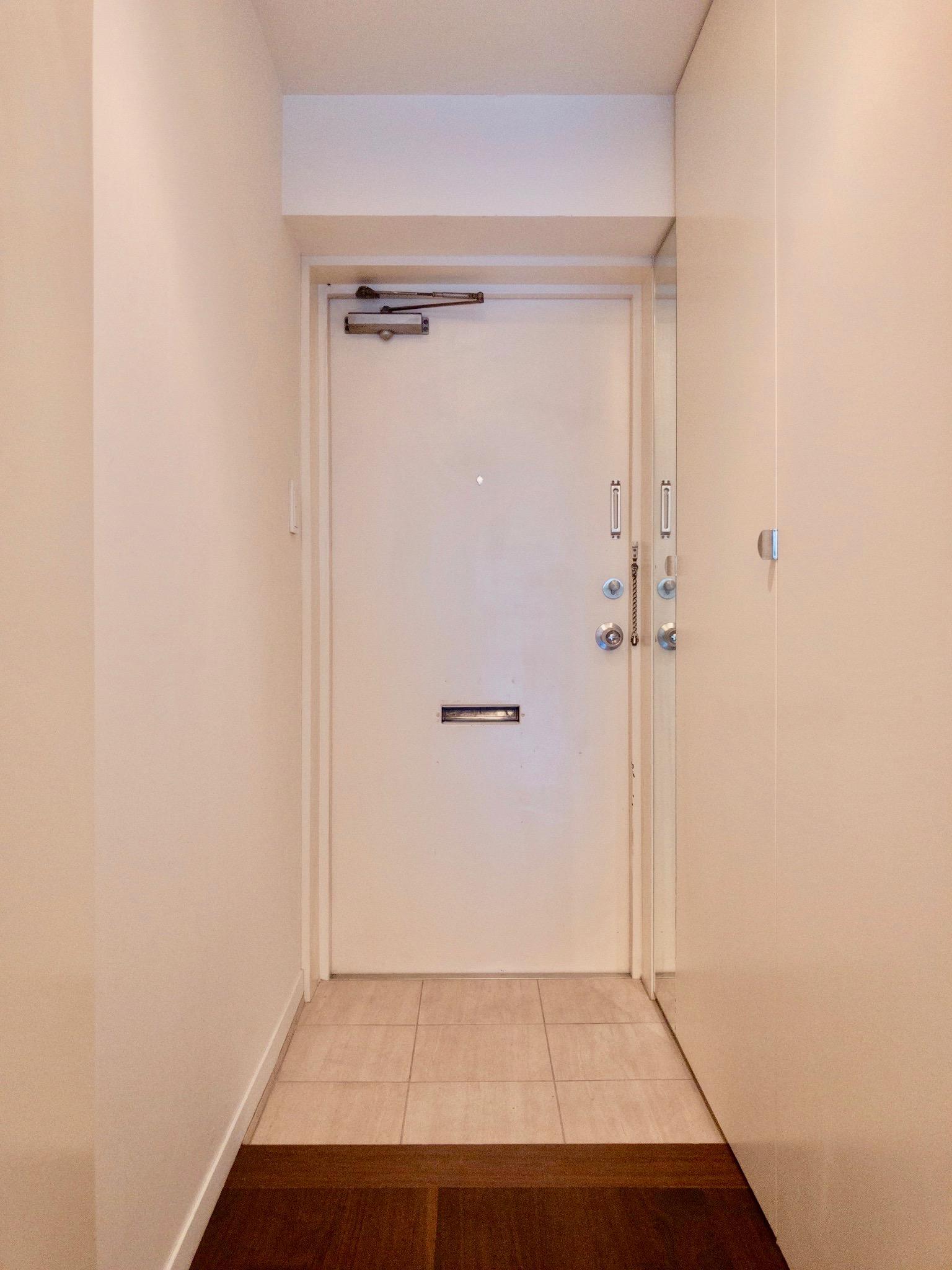 左手には姿見、靴収納、もともと洗濯機置き場であっただろう収納スペースがあったりと、玄関としては申し分のない充実設備がありました。