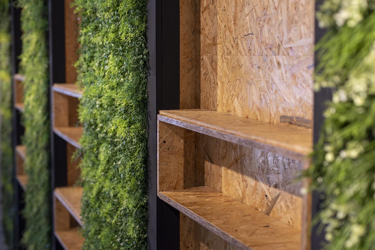 写真の通り、グリーンが印象的でライティングの効いたユニークな飾り棚を設置。