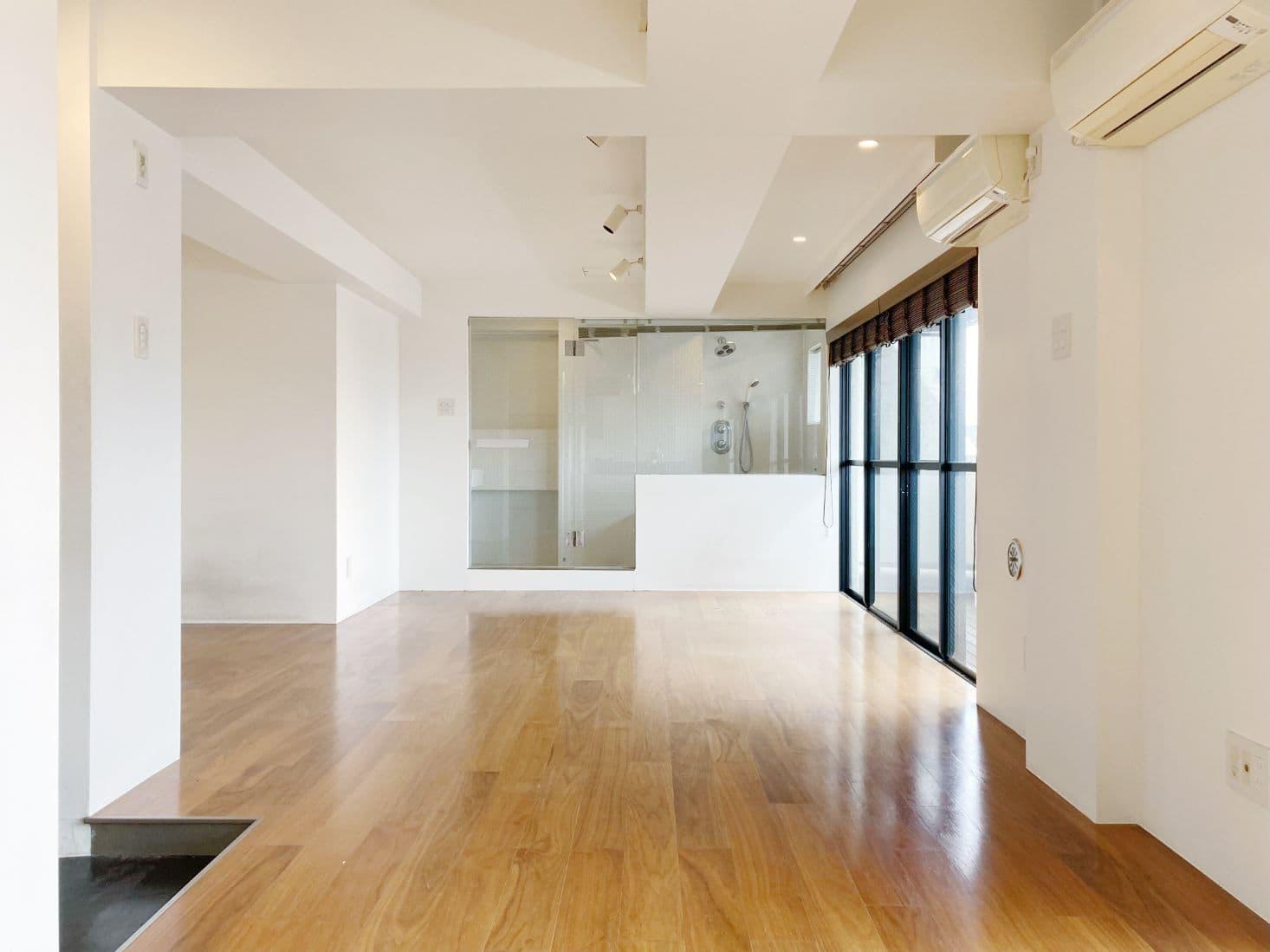 白い壁と質感のあるフローリングが柔らかい印象の室内に。
