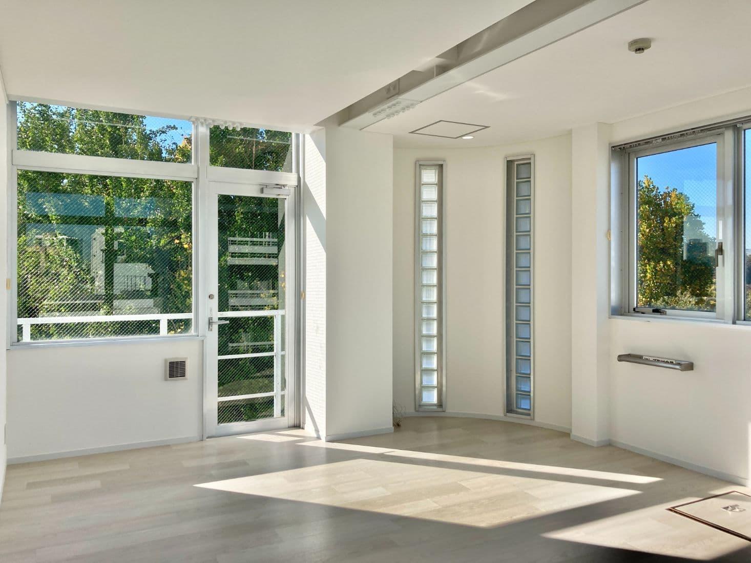 大開口窓に囲まれた、開放感たっぷりの室内。