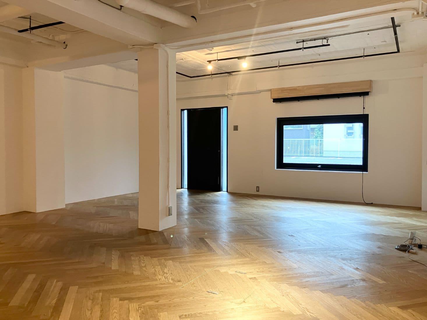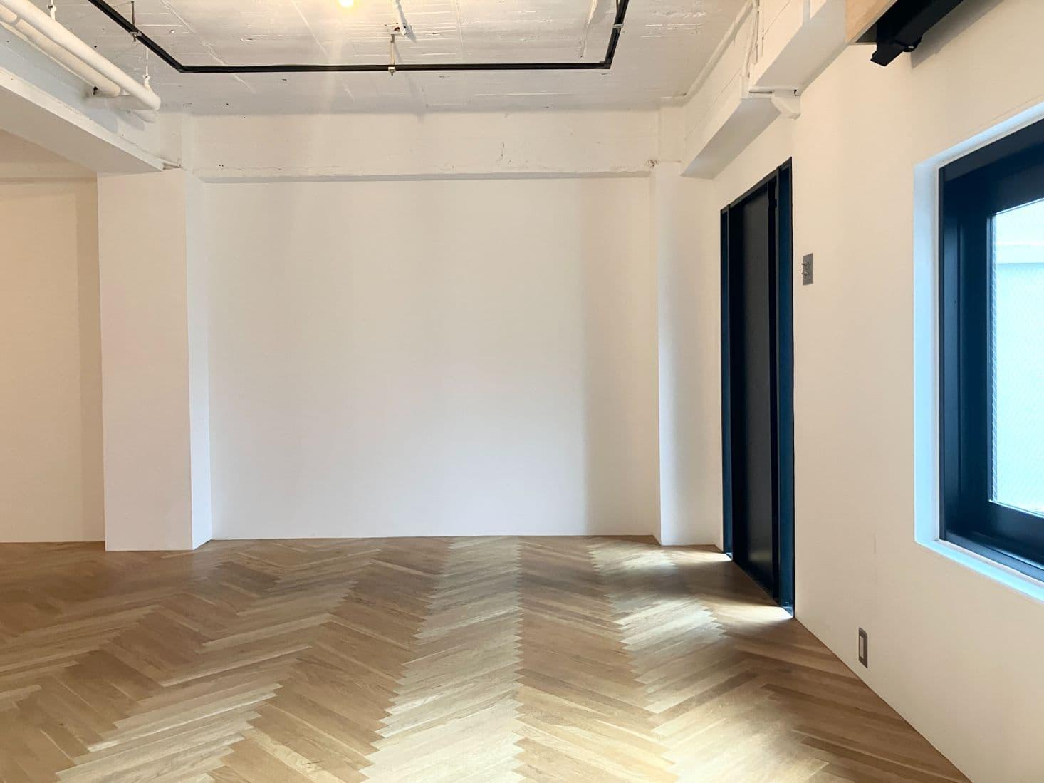 内装はスケルトンのダクト剥き出し、白塗装、床は可愛らしいヘリボーンでお仕上げ。