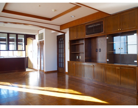 反対側にあるリビングダイニングに行きますと、サンサンと西日が差し込み気持ちの良い時間を過ごさそうです。西日が入るということは、夕方おうちに帰ってきたときにお部屋が寒くないといった利点があります。 壁が一面収納になっているのでいろいろなものが収められそうです。