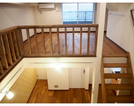 天高約4mの吹き抜けとシーリングファン、吹き抜け周りの木製の囲いが印象的なメゾネットタイプ。