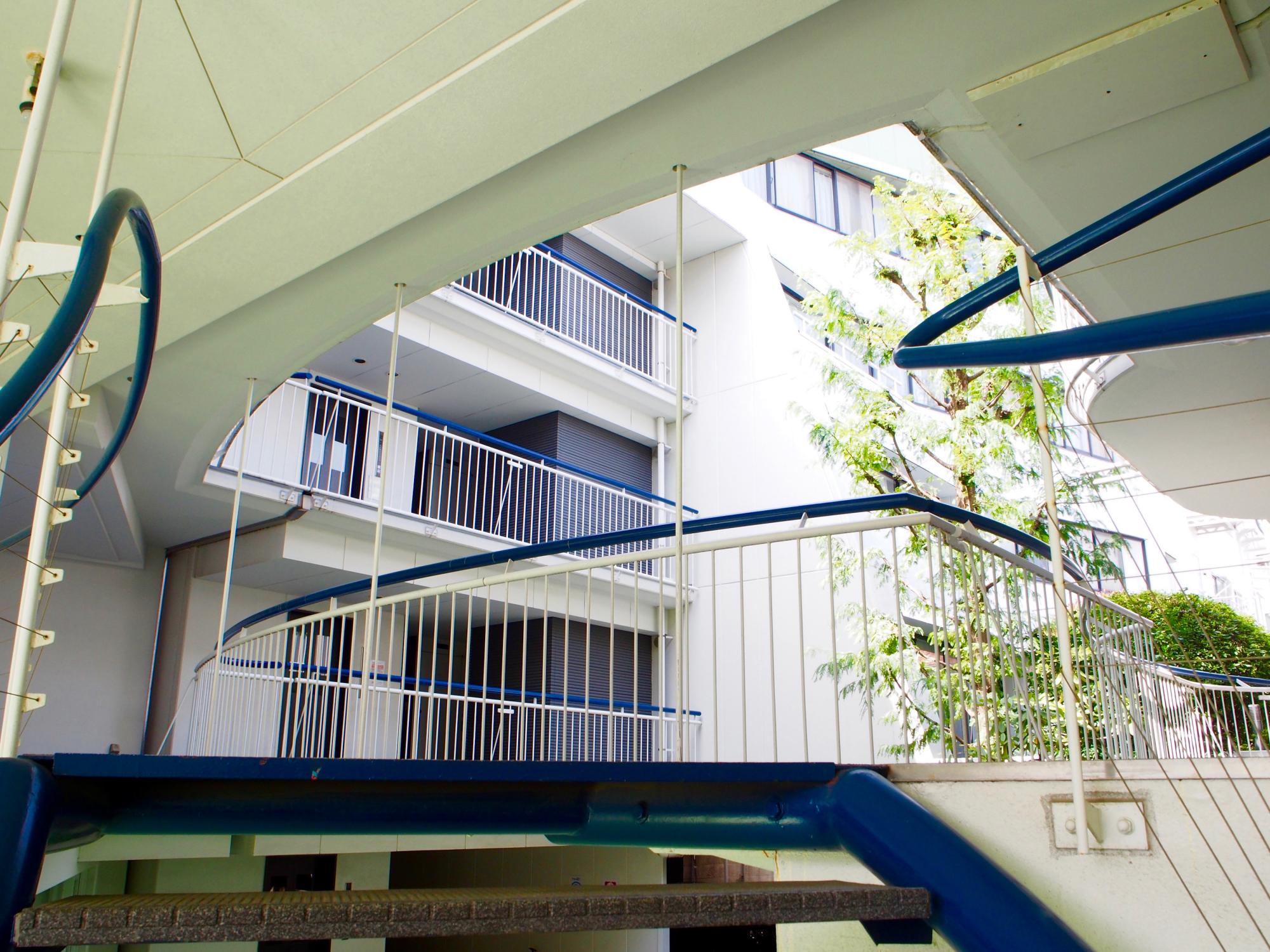 湾曲した鮮やかなブルーの手摺りが素敵。