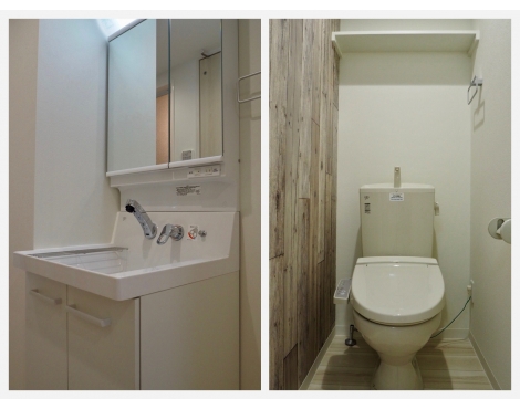 温水洗浄便座に浴室乾燥機、独立洗面台にはシャワーヘッド付き、2口ガスコンロ