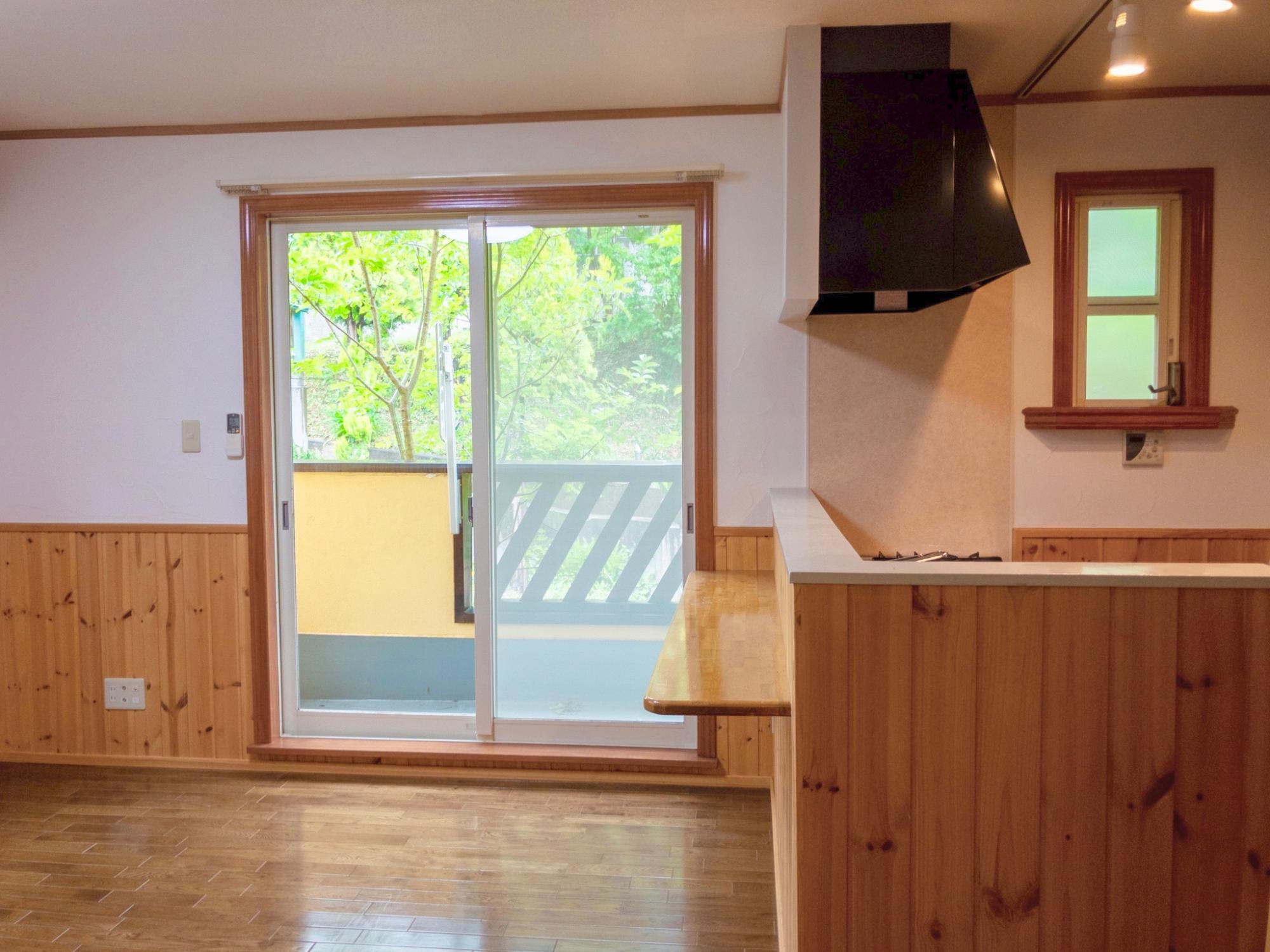【102号室】リビング入口から。こちらは正面が上げ下げ窓です。