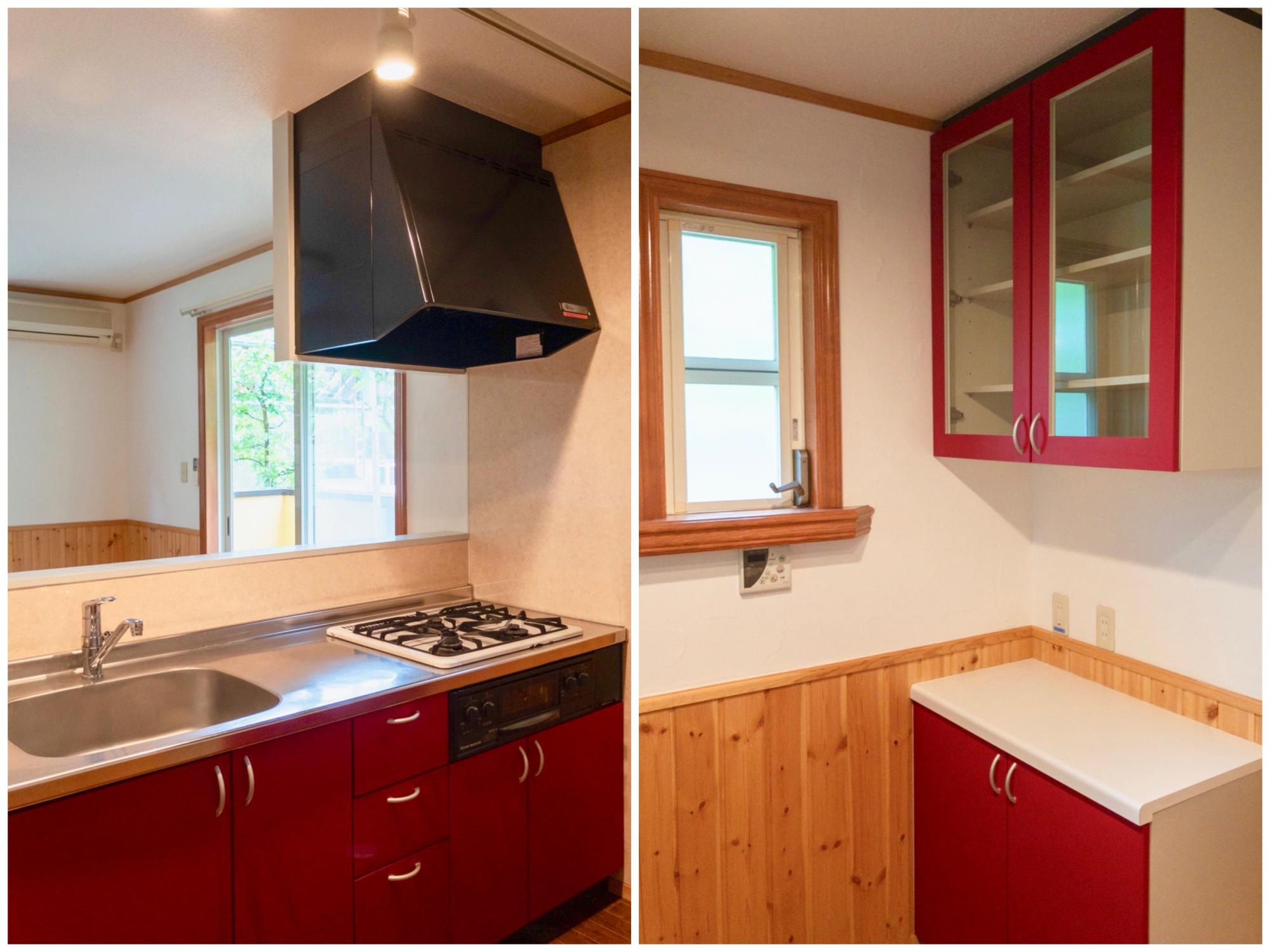 【106号室】赤のアクセント、3口ガスコンロつきのキッチン。