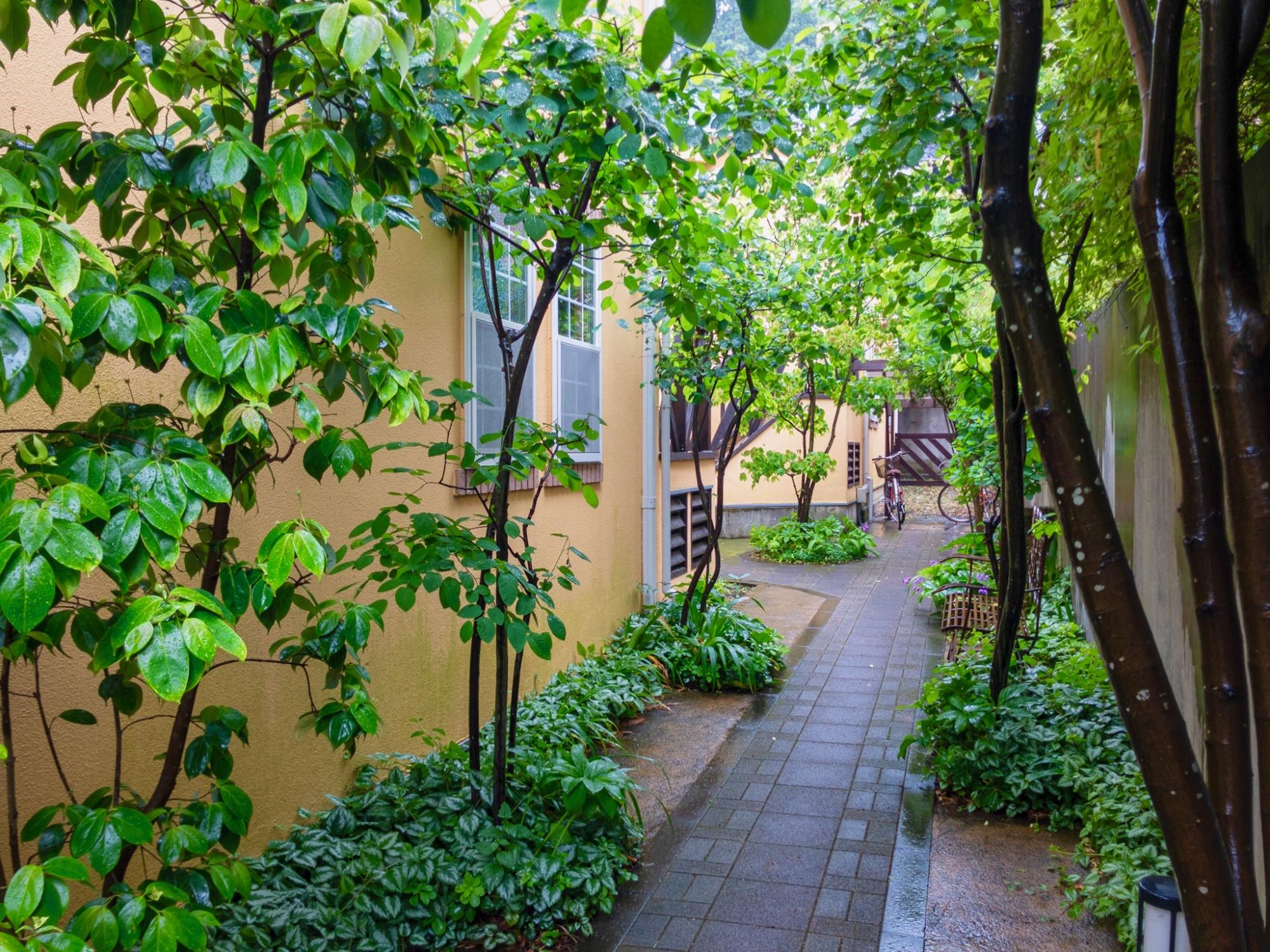 オートロックを入った先にはマイナスイオンを感じる小道。ここを抜けてお部屋に向かいます。突当りには屋根付き駐輪場。
