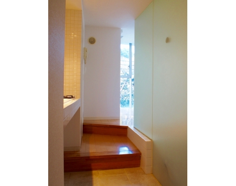 室内は玄関ホールをかねたフロアタイルの4帖ほどのリビングスペースと、緑の窓に面するベッドスペース、そしてその間にガラス張りのバストイレ、キッチンという構成。