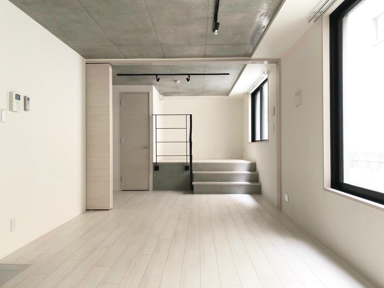 壁面の一部はコンクリート打ち放し。居室内に高低差をつけて数段のステップで繋ぐスペースデザイン。