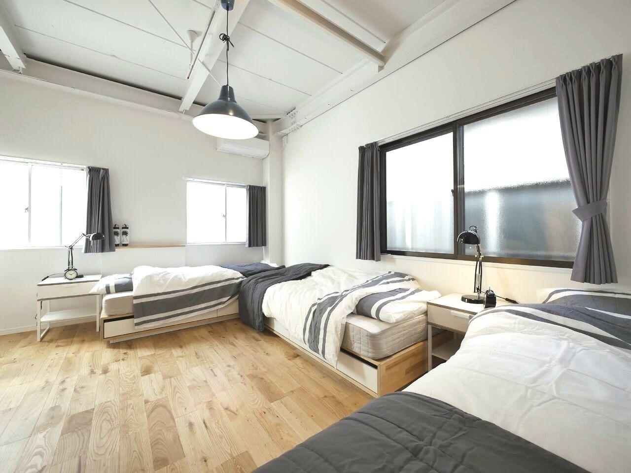 玄関周りにバスルームやトイレがあって、奥側に寝室がふたつ。