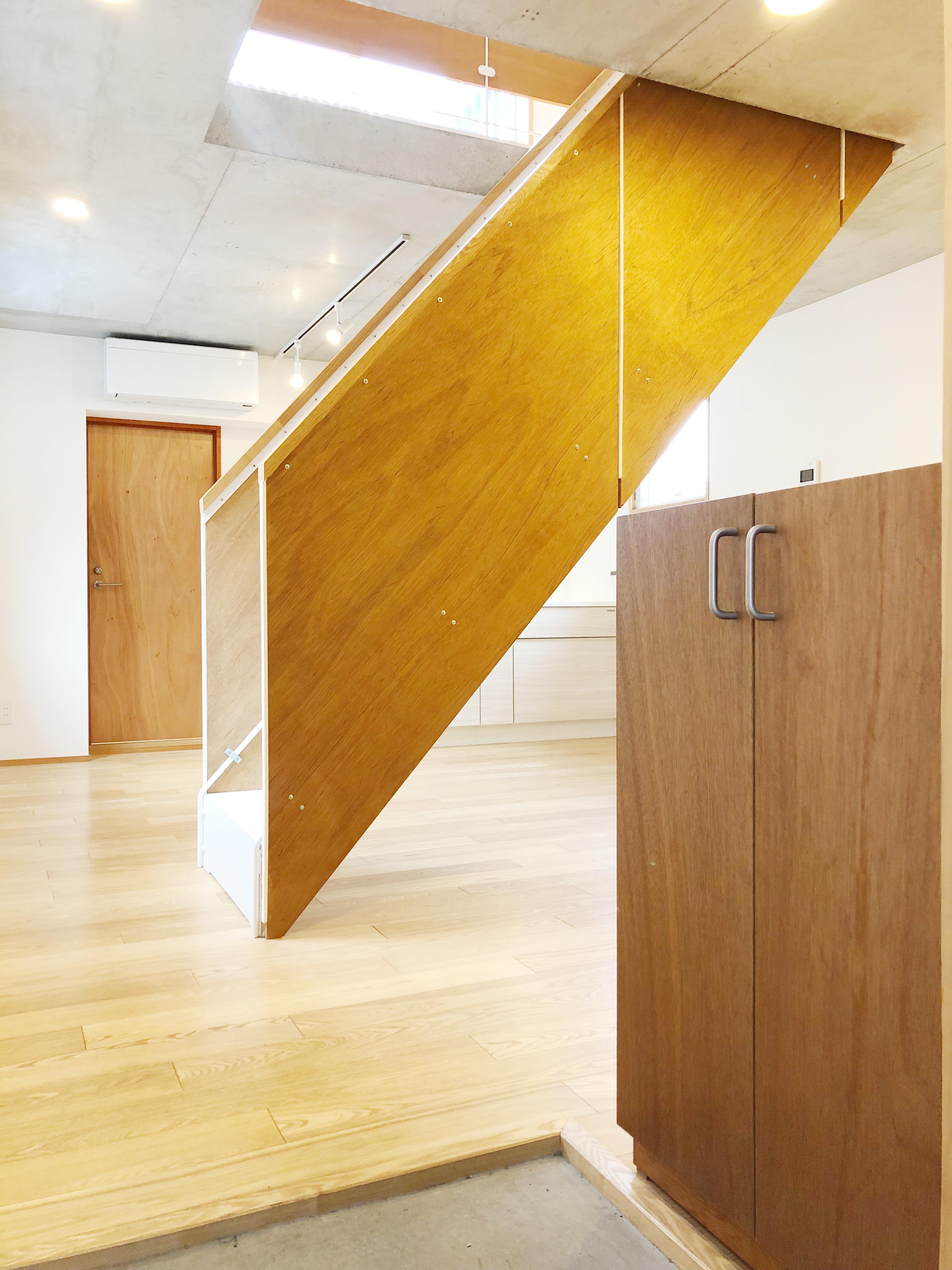 玄関のある2階にキッチンや水回りがまとまっており、リビングスペースも確保されています。