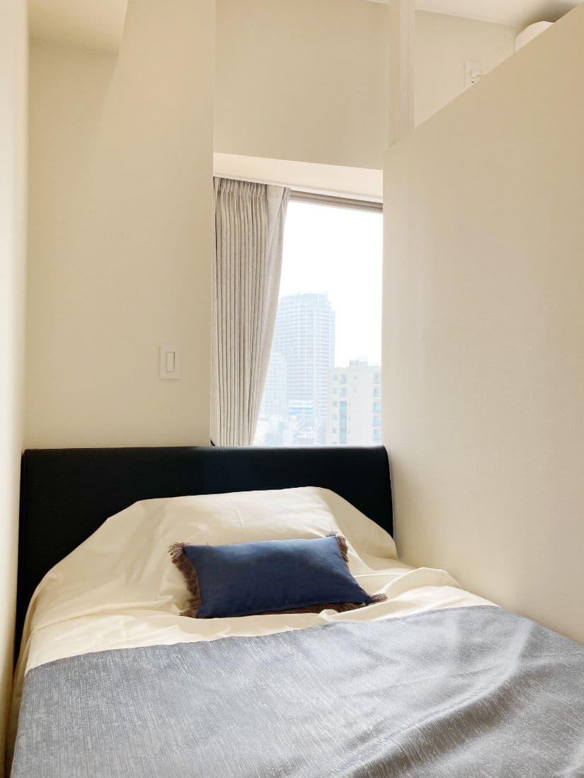 壁があることで、寝室空間も確保。セミダブルベッドがピッタリ置ける広さです。
