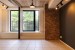黒の照明、煉瓦の壁に、濃い色味の壁紙も。