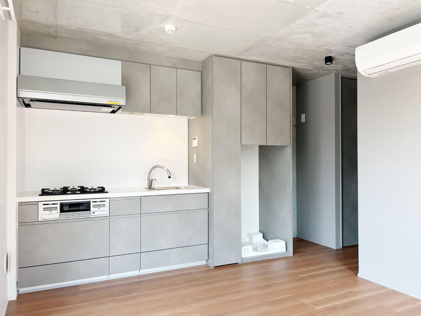 コンクリート打ちっぱなしの壁と同系色のキッチンがスタイリッシュ。