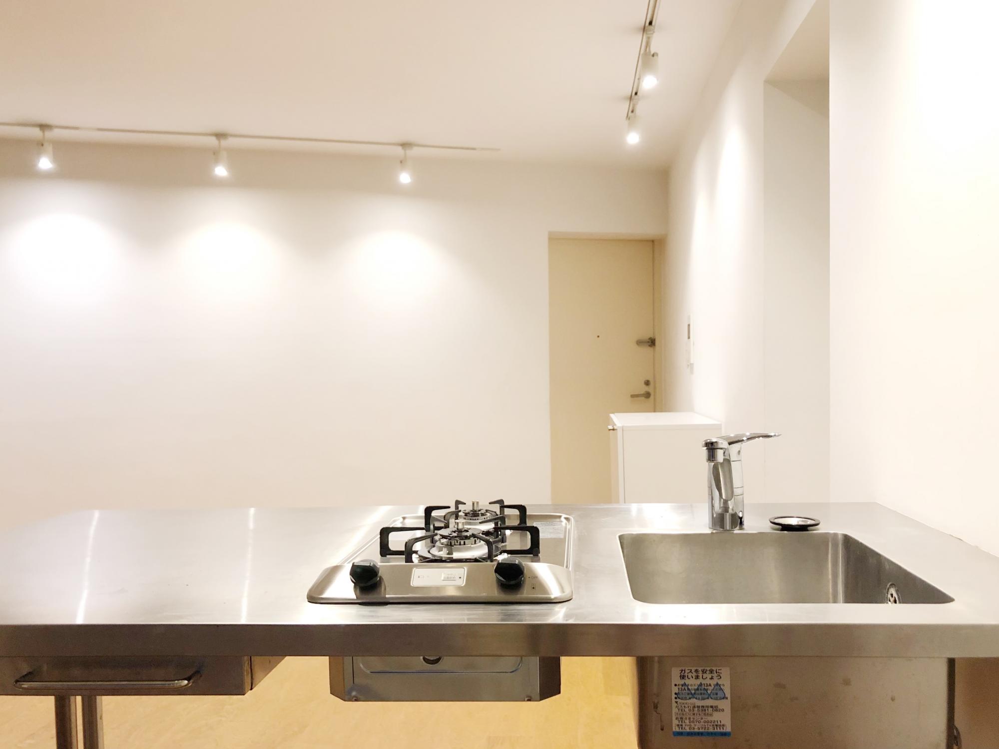 柱などのグレー、キッチンのシルバーがミックスされることによって演出される、このデザイナーズ感。