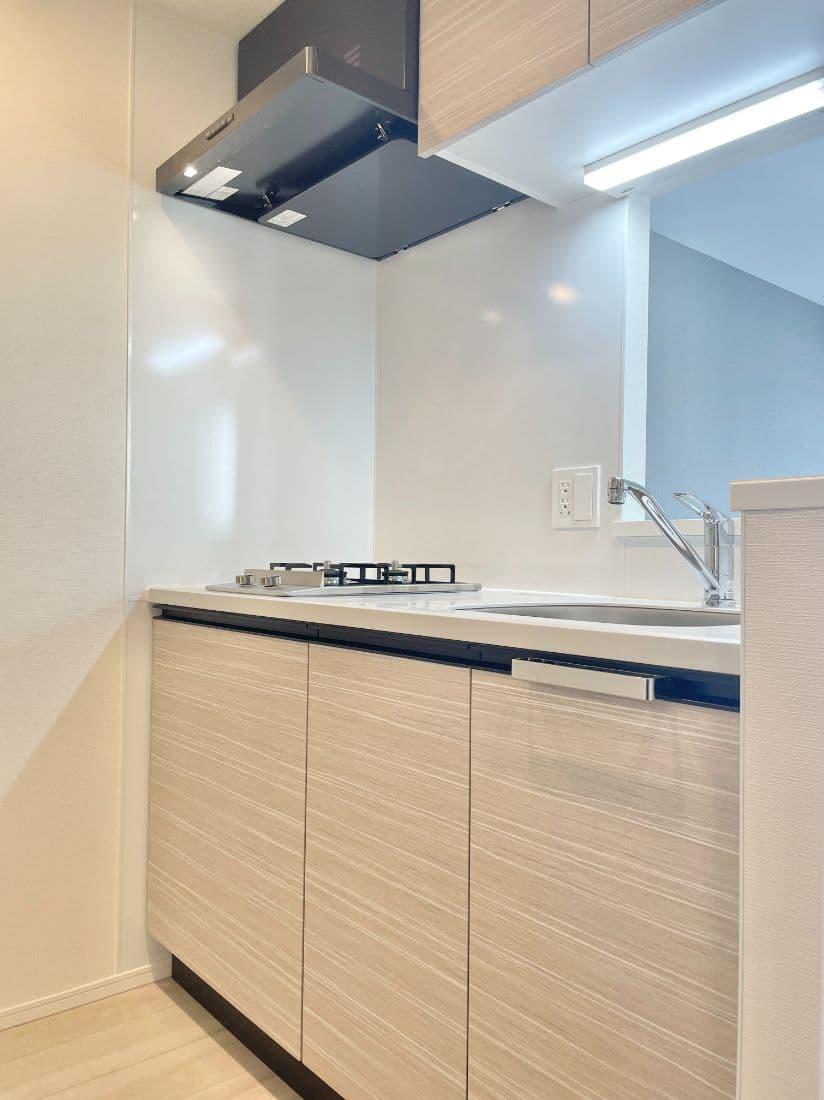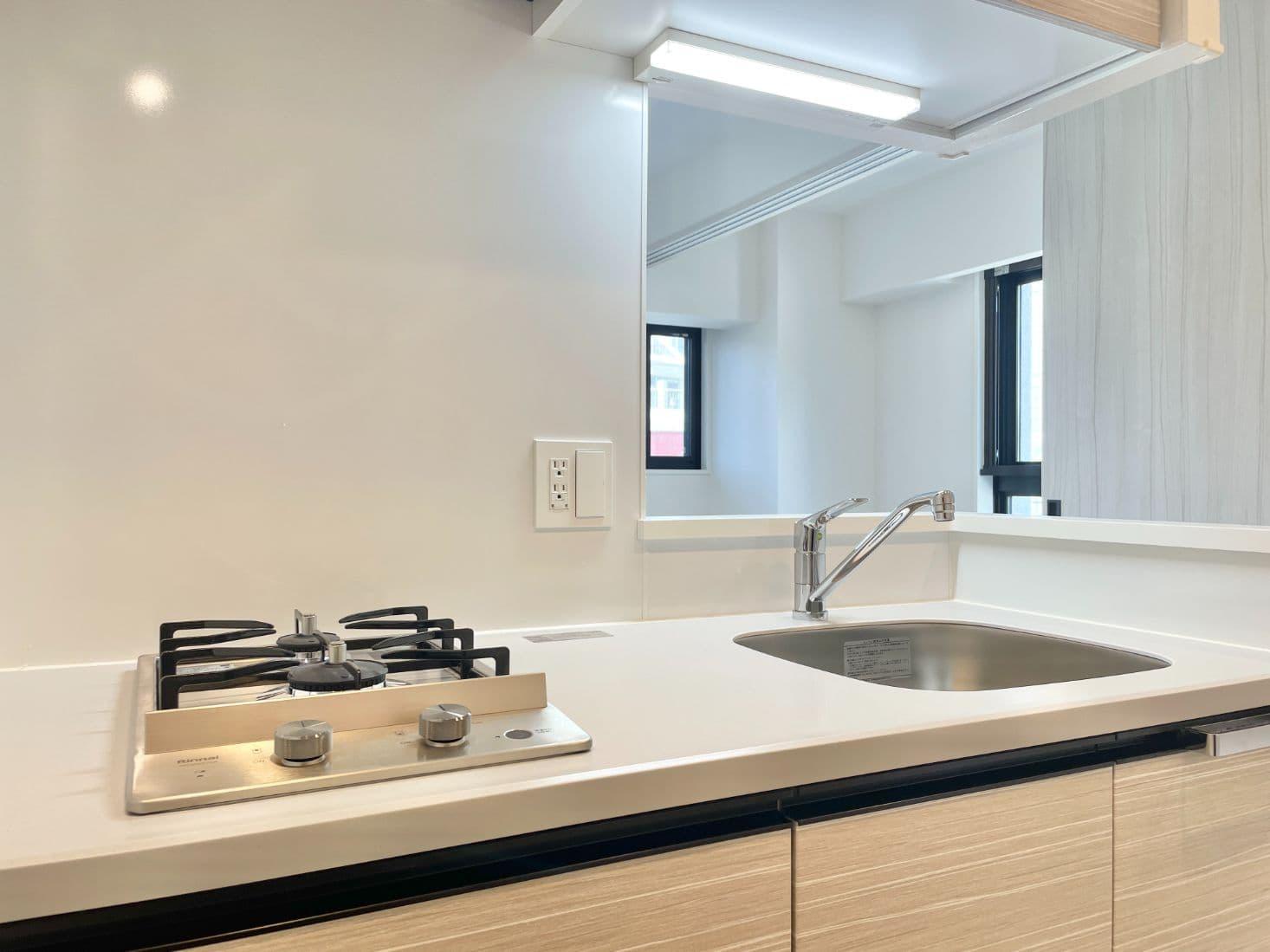キッチンは、ガスコンロ2口でキッチン収納も充実で楽々料理を楽しんでください!