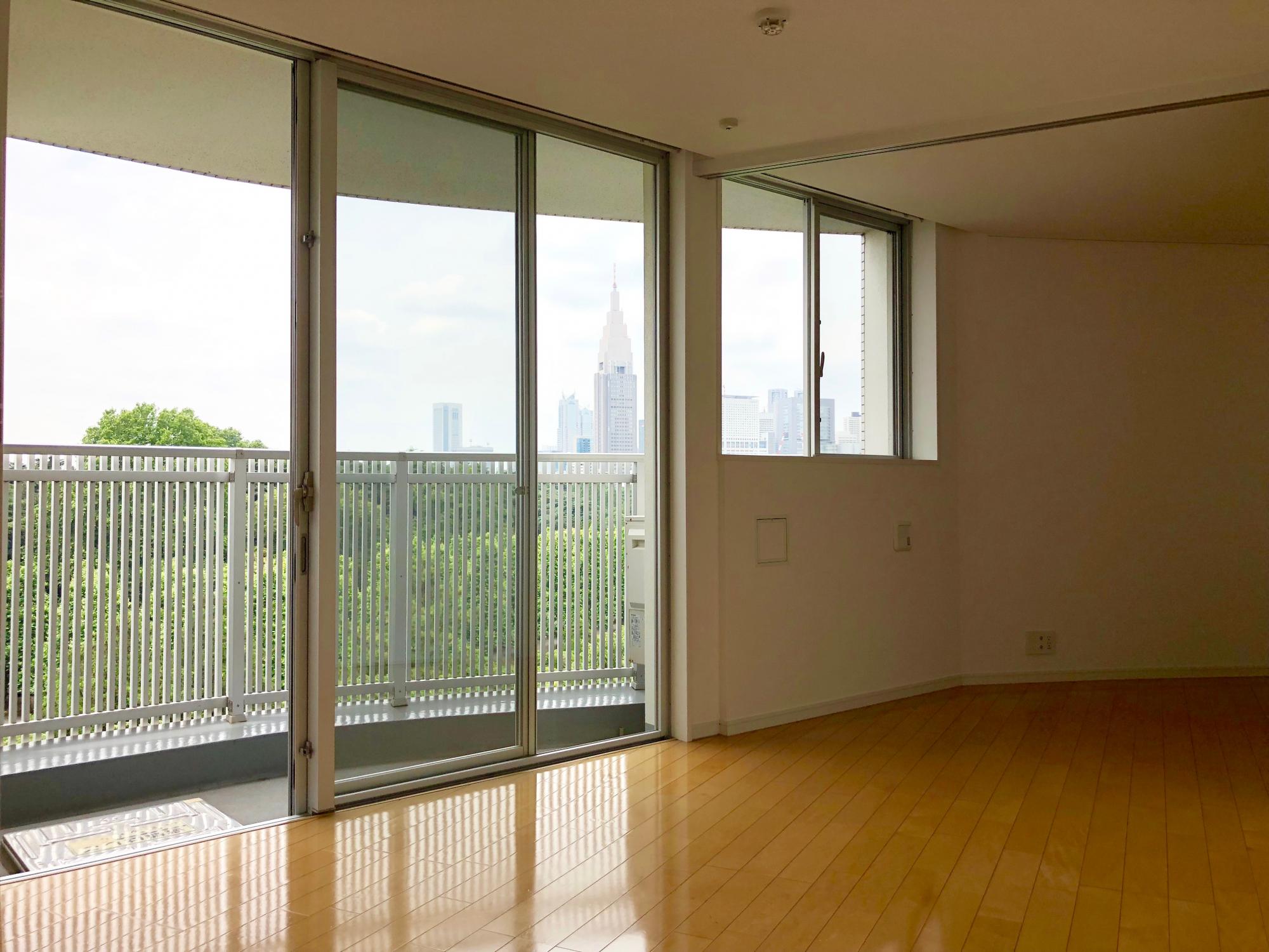 ベランダが新宿御苑に沿った形状で作られている為、