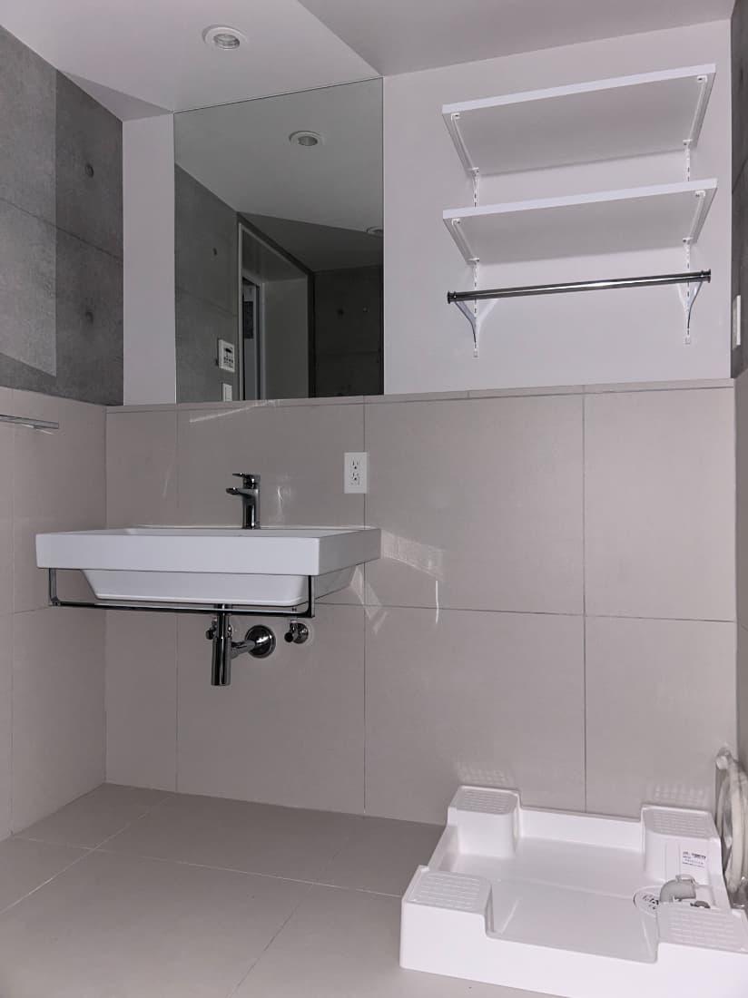 無機質なコンクリートの壁と、温かみのあるフローリングが調和した空間です。
