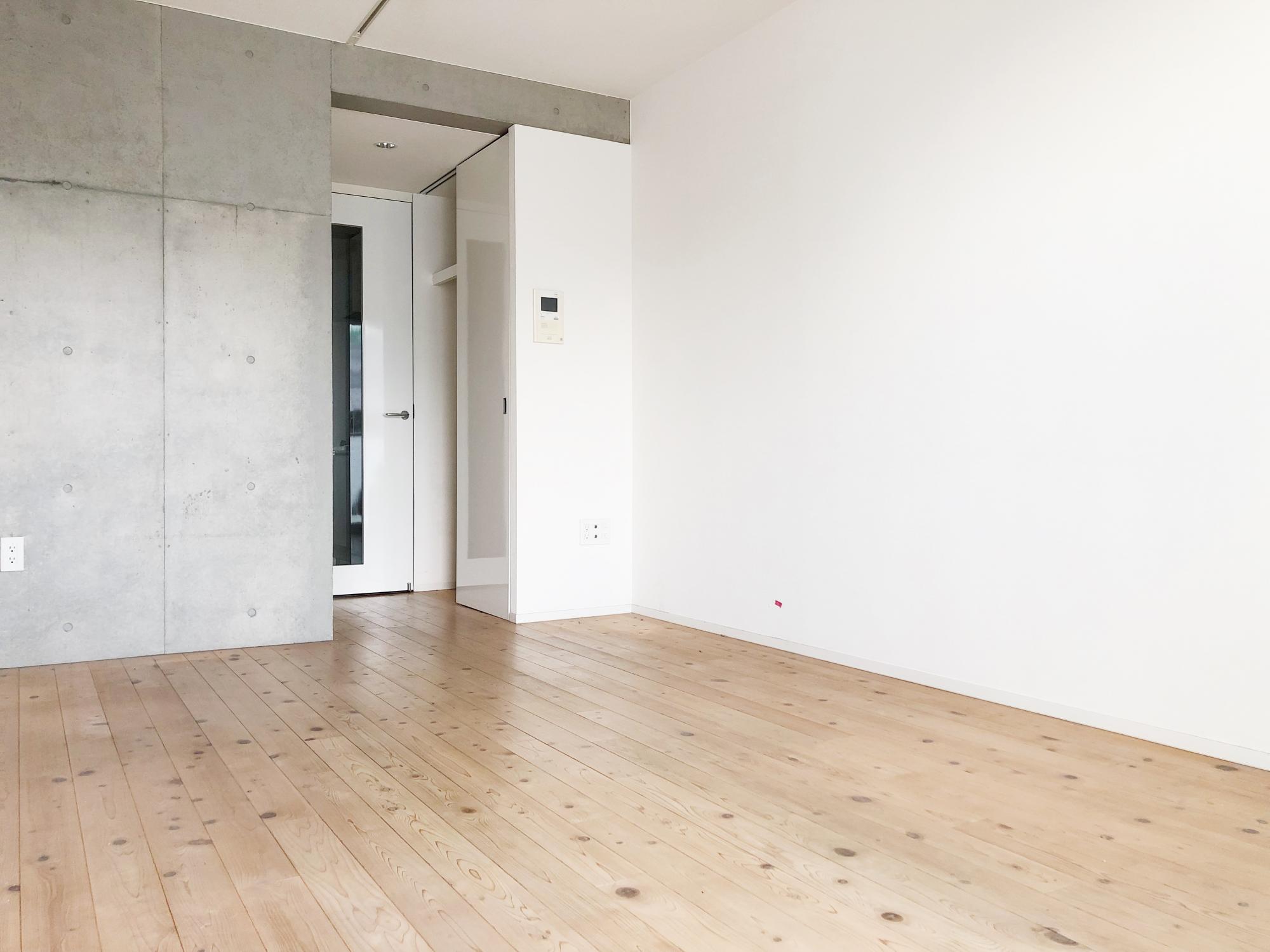 すっきりとしたお部屋ですが、国産の杉・檜を採用した無垢フローリングや コンクリート打ちっ放しの壁材を使っていたりと内装には拘っています。