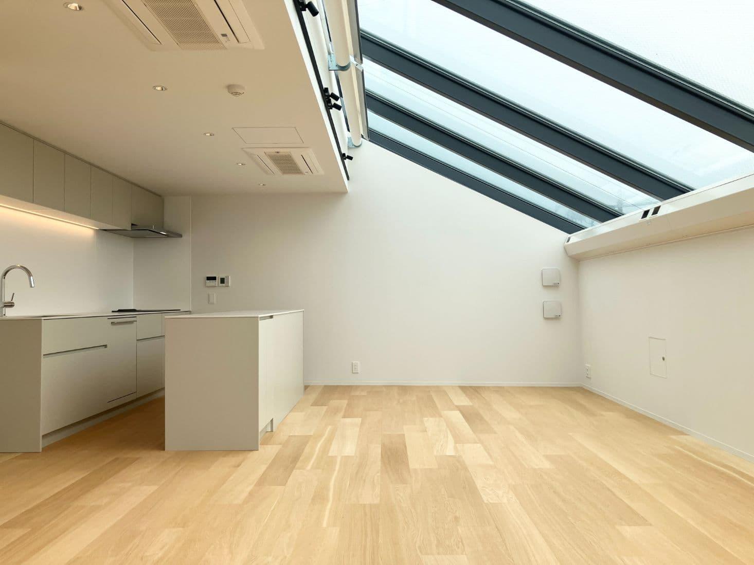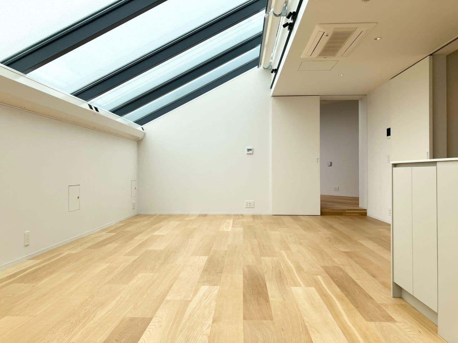 天井の半分が窓!青空が広がるリビング。(撮影時はあいにくのお天気でした..)