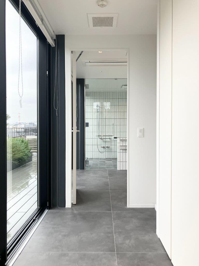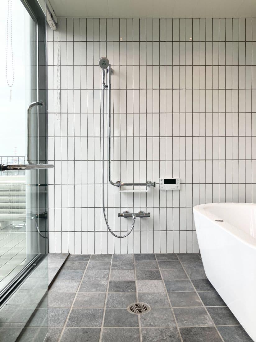 ガラス張りのバスルームはルーフバルコニーを見ながら入浴できる。