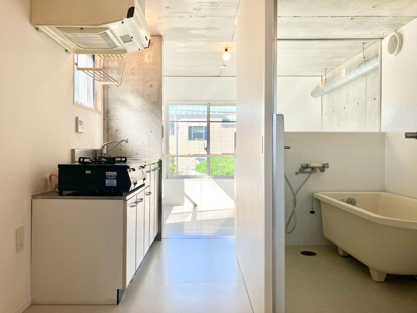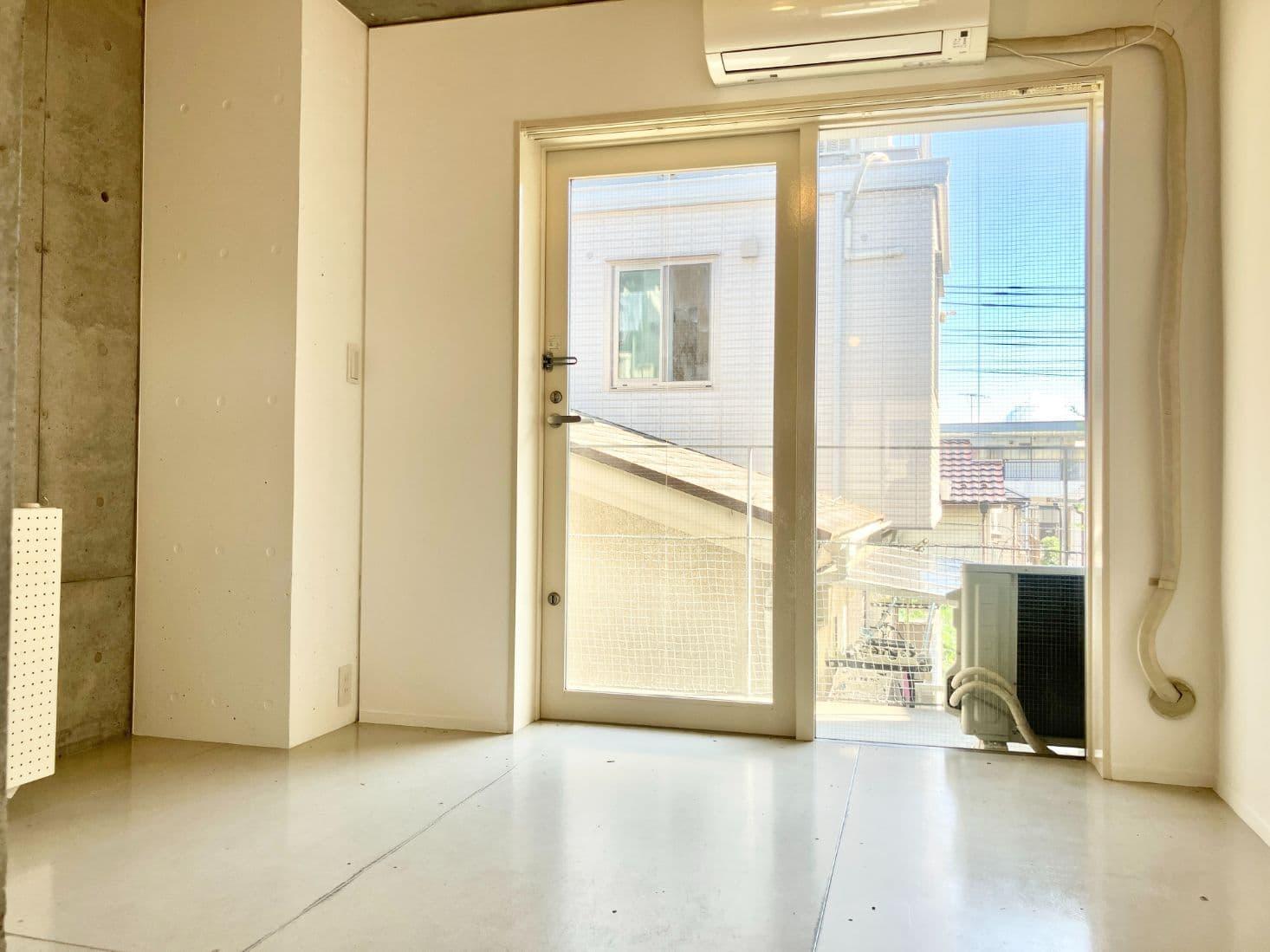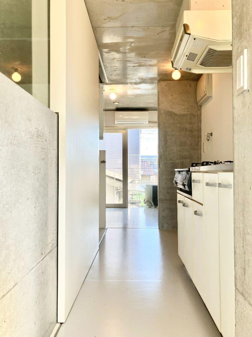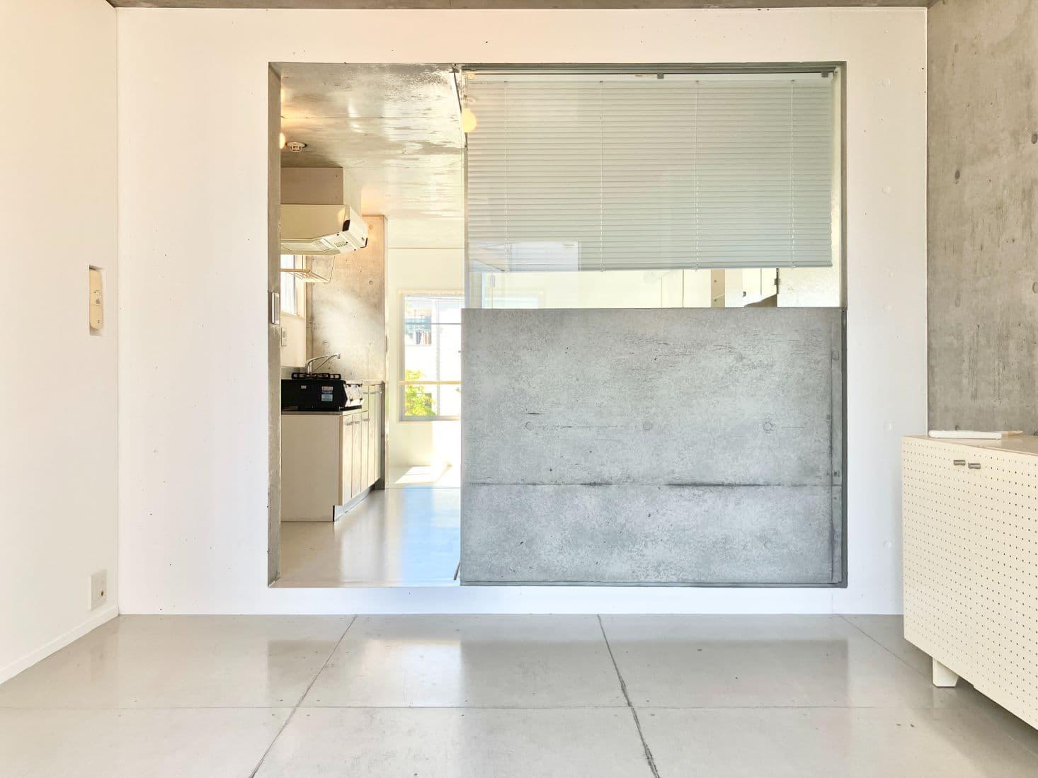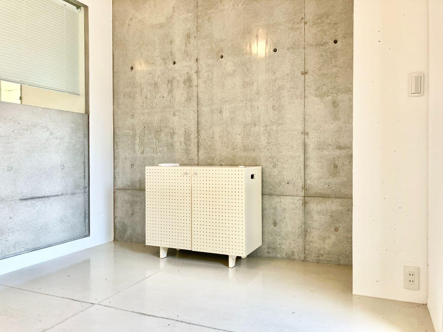 玄関を開けると、コンクリートと白で統一された無機質な空間がお出迎え。
