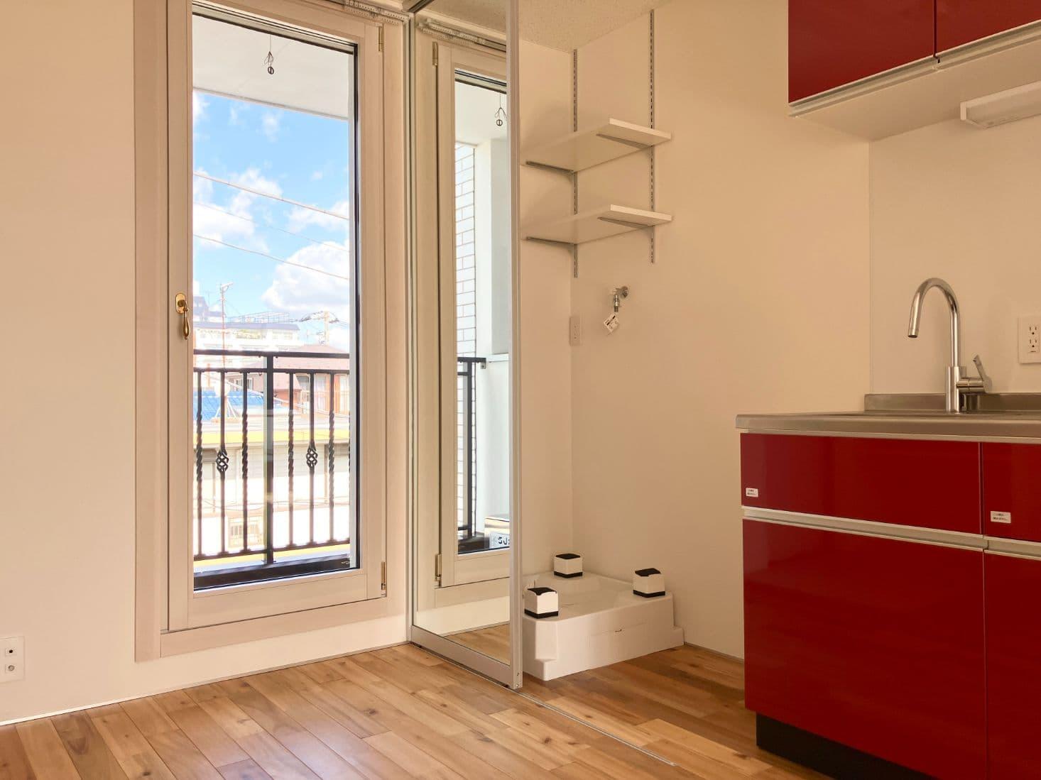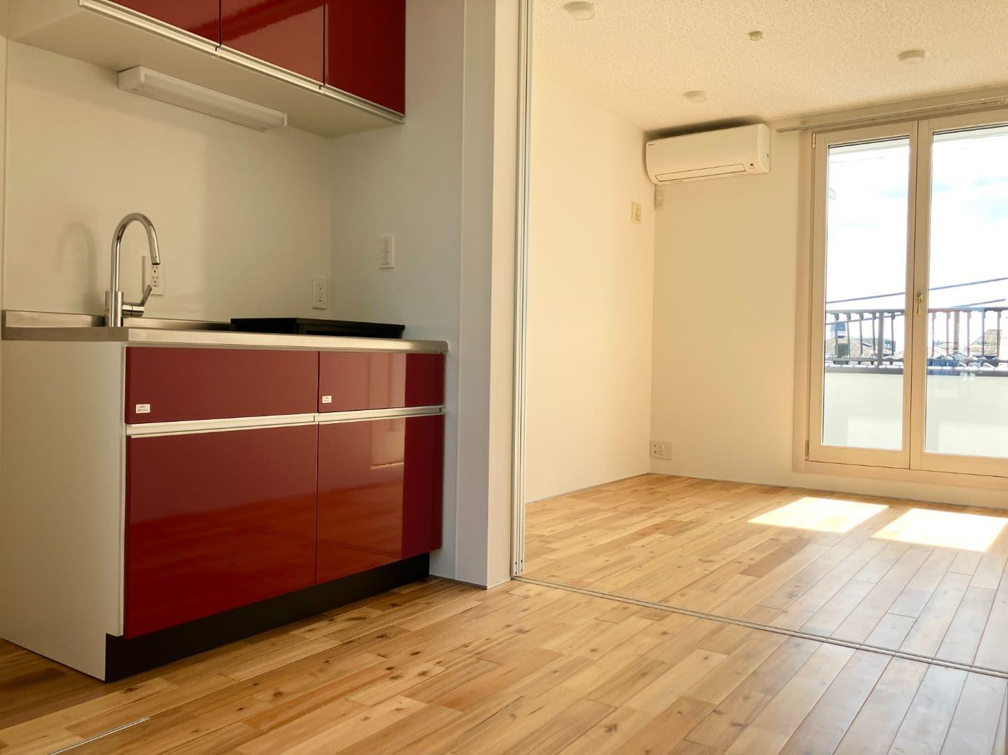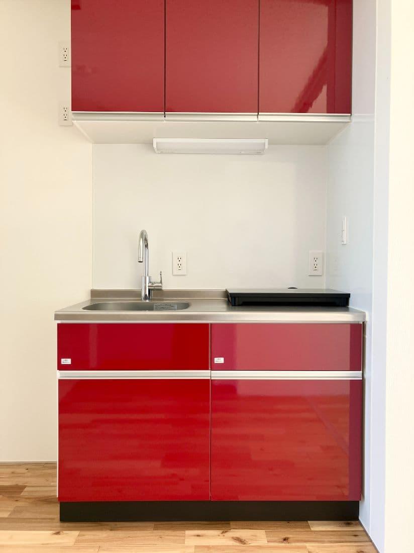 まずお部屋に入って赤のキッチンに目がいきました。