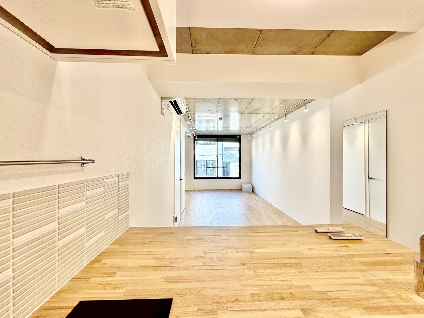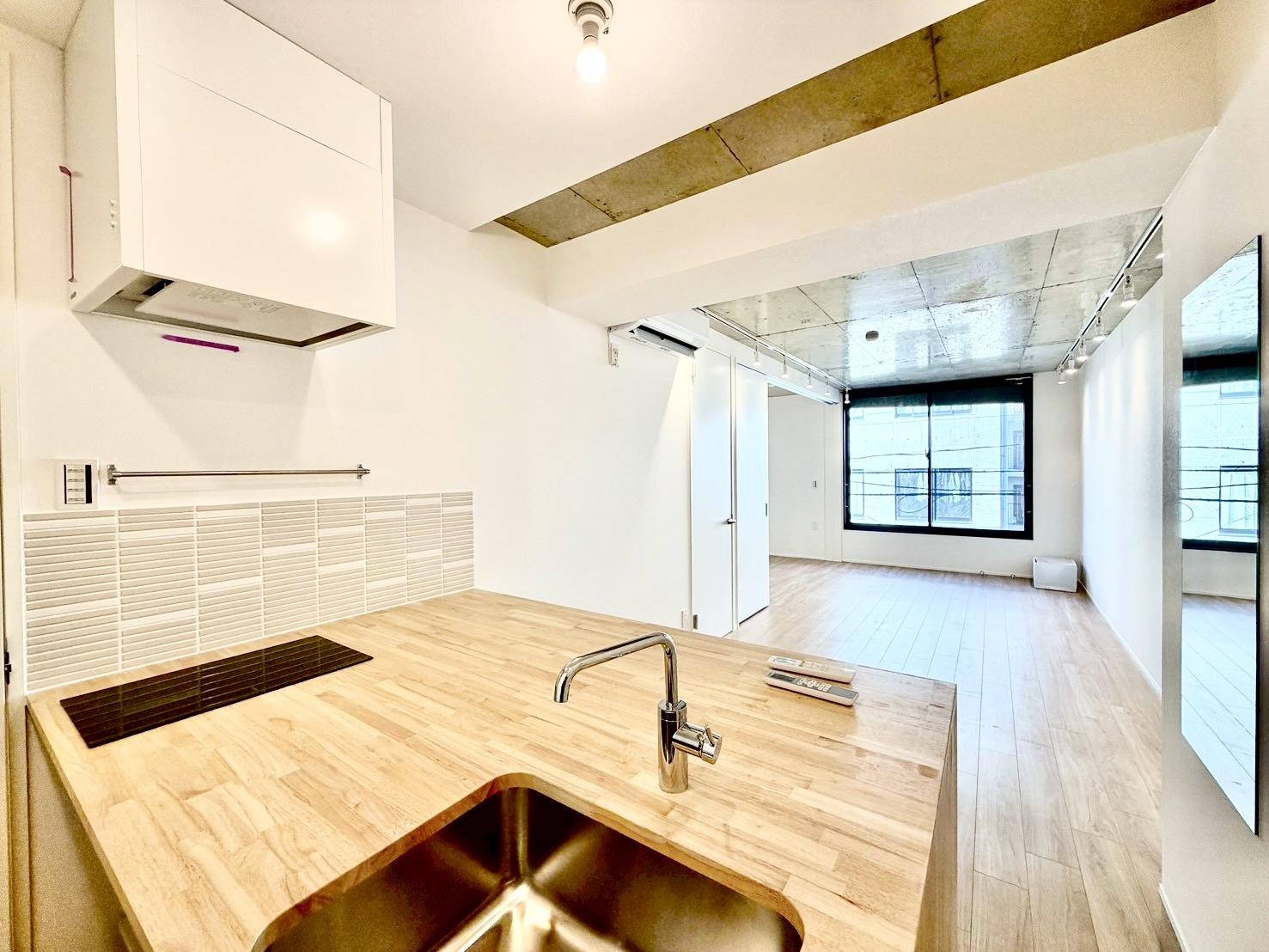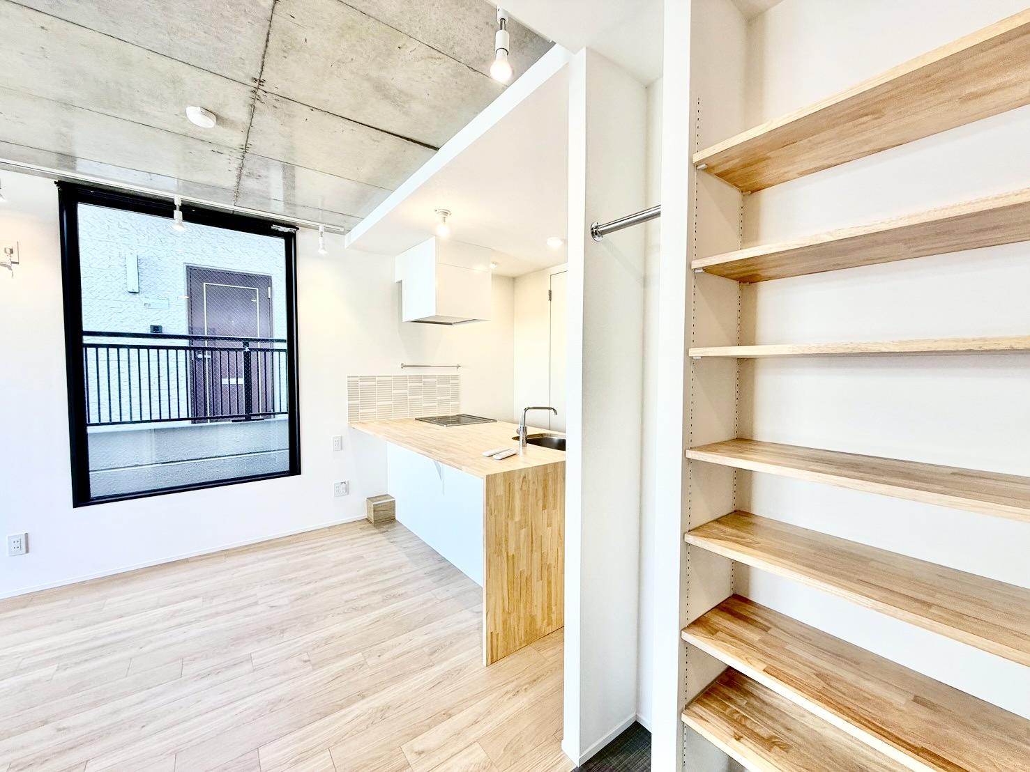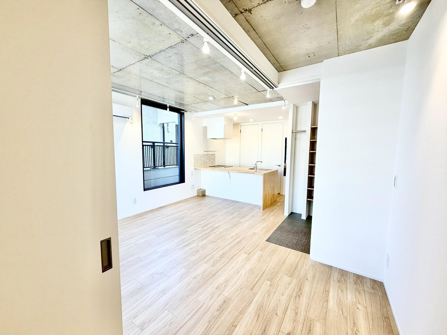 お部屋のドアを開けて、まず目に飛び込んでくるのは、コンクリート打ちっ放しの天井。インダストリアルでクールな印象ですが、床材やキッチンのカウンターには温かみのある木が使われていて、絶妙なバランスを保っています。照明はライティングレールなので、気分や家具の配置に合わせて好きな場所を照らせるのも嬉しいポイントです。
