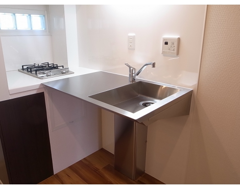 ブラウンカラーな壁や木目が素敵なフローリング、スタイリッシュなキッチン。