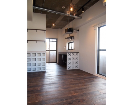 古材のような味わいのある無垢床に、可愛らしいガラスの照明。