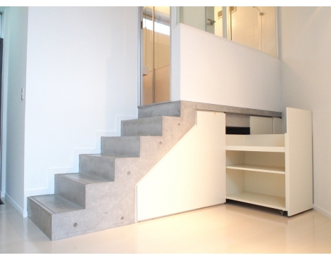 205号室は三角形に近い間取りですが、収納はが可動式でよかった!すきな場所に移動できるので、レイアウトはおまかせします。