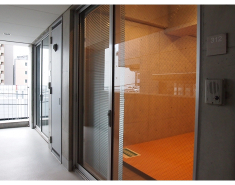 まず驚くは玄関。一面ガラス張りですが、ブラインドがついているのでご安心ください。