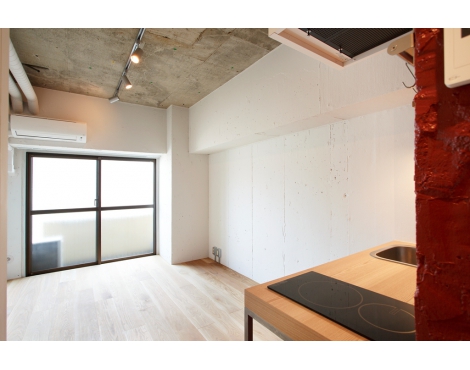 壁面にペイントされたアクセントカラー(朱色)と経年変化漂うコンクリートブロックが調和する空間は、シンプルながらも個性溢れる雰囲気で、窓から眺める超高層ビル街の夜景が加われば、あなたの日常をスタイリッシュなものに演出してくれます。