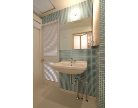独立洗面台の壁はエメラルドグリーンのタイル。