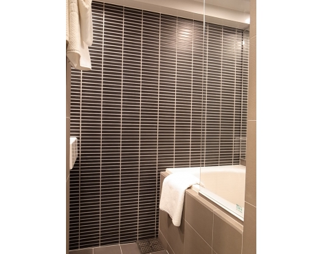 水回りは基本的に少しコンパクトですが、お風呂はタイル張りでオシャレ。小さいけれども洗面台もついています。